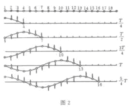由于相鄰質(zhì)點間力的作用,當介質(zhì)中某一質(zhì)點發(fā)生振動時,就會帶動周圍的質(zhì)點振動起來,從而使振動向遠處傳播。例如:圖2表示繩上一列波的形成過程。圖中1到18各小點代表繩上的一排質(zhì)點,質(zhì)點間有彈力聯(lián)系著。圖中的第一行表示在開始時刻(t=0)各質(zhì)點的位置,這時所有質(zhì)點都處在平衡位置。其中第一個質(zhì)點受到外力作用將開始在垂直方向上做簡諧運動,設(shè)振動周期為T,則第二行表示經(jīng)過了T/4時各質(zhì)點的位置,這時質(zhì)點1已達到最大位移,正開始向下運動;質(zhì)點2的振動較質(zhì)點1落后一些,仍向上運動;質(zhì)點3更落后一些,此時振動剛傳到了質(zhì)點4。第三行表示經(jīng)過了T/2時各質(zhì)點的位置,這時質(zhì)點1又回到平衡位置,并繼續(xù)向下運動,質(zhì)點4剛到達最大位移處,此時振動傳到了質(zhì)點7。依次推論,第四、五、六行分別表示了經(jīng)過3T/4、和5T/4后的各質(zhì)點的位置,并分別顯示了各個對應時刻所有質(zhì)點所排列成的波形。