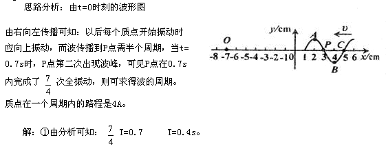 解:(1)振幅是質(zhì)點(diǎn)偏離平衡位置的最大位移,波長(zhǎng)是兩個(gè)相鄰的峰峰或谷谷之間的距離,所以振幅A=5cm,波長(zhǎng)=20m。