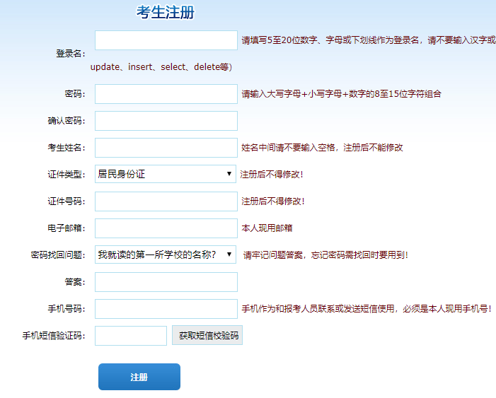 提示:報名前注冊的考生可以直接填寫登錄報名,沒有注冊的考生需要先進(jìn)行注冊在登錄報名。點(diǎn)擊注冊按鈕,進(jìn)入注冊頁面。