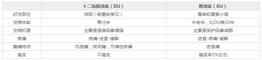 消化性潰瘍主要指發(fā)生在胃和十二指腸的慢性潰瘍,即胃潰瘍(GU)和十二指腸潰瘍(DU),消化性潰瘍主要癥狀為腹痛,特點有:慢性過程、周期性發(fā)作、節(jié)律性、服用抑酸劑可緩解。我們一起來看一下胃潰瘍和十二指腸潰瘍各自會有哪些典型的特點。