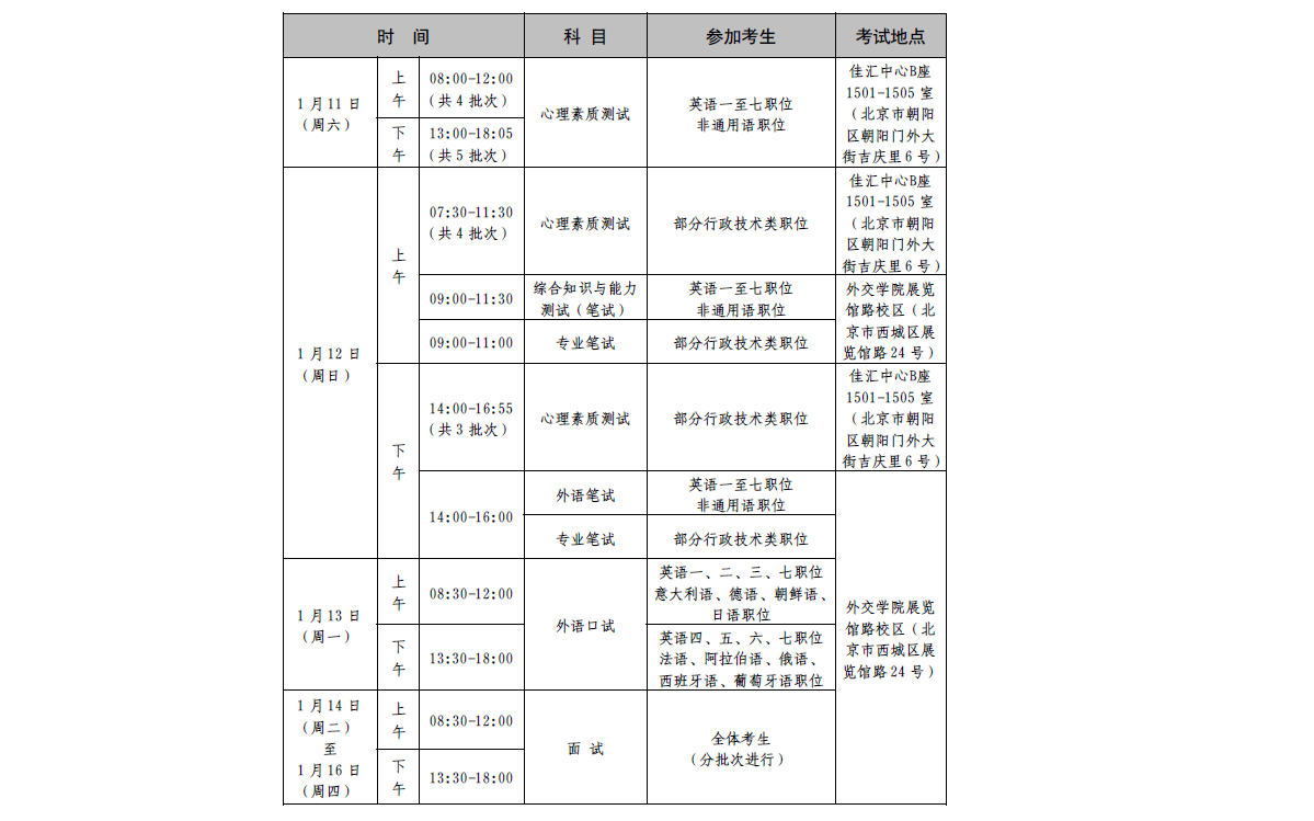 外交部2020年度考試錄用公務(wù)員專業(yè)能力測試和面試定于2020年1月12日至16日在北京集中舉行,并于1月11日至12日分批次進(jìn)行心理素質(zhì)測試。根據(jù)中央公務(wù)員主管部門2020年度考試錄用公務(wù)員工作安排,現(xiàn)將有關(guān)事項(xiàng)公告如下:
