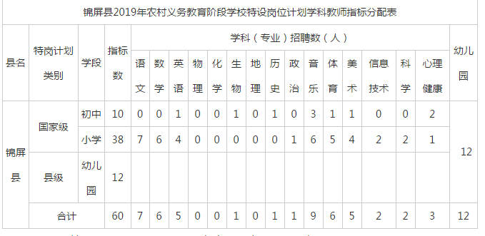 詳見“錦屏縣2019年農(nóng)村義務(wù)教育階段學(xué)校特設(shè)崗位計(jì)劃學(xué)科教師指標(biāo)分配表”(附表)。