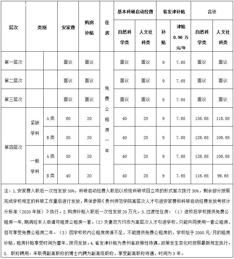 貴州師范學(xué)院2020年高層次人才引進待遇一覽表(單位:萬元)