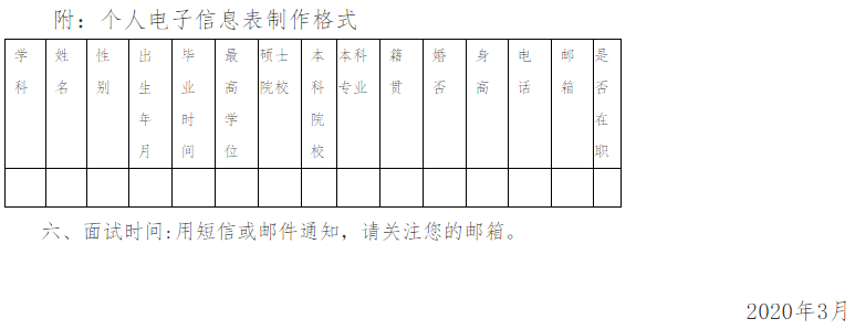 有意應(yīng)聘的,請(qǐng)將個(gè)人詳細(xì)簡歷和電子信息表發(fā)送到招聘郵箱。郵件標(biāo)題為:學(xué)科+姓名+畢業(yè)學(xué)校(如:音樂+張三+河南大學(xué))。用excel制作電子信息表(請(qǐng)一定按格式要求填寫,某項(xiàng)條件不具備的,該項(xiàng)可不填)。