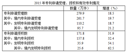 2015年,全國研究與試驗(yàn)發(fā)展經(jīng)費(fèi)支出14220億元,與國內(nèi)生產(chǎn)總值之比為2.1:100,其中基礎(chǔ)研究經(jīng)費(fèi)671億元。截至年底,全國共擁有有效專利547.8萬件,其中境內(nèi)有效發(fā)明專利87.2萬件,每萬人口境內(nèi)有效發(fā)明專利擁有量6.3件。
